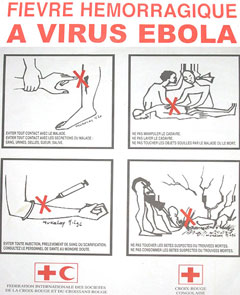 Ce dernier a rappelé qu’actuellement nous ne disposons ni de vaccin ni de médicament pour prévenir ou soigner la maladie. C’est pourquoi il convient d’éviter tout contact avec les personnes atteintes pour se protéger. La transmission du virus s’effectue par contact direct avec le sang, les liquides biologiques ou les tissus des sujets infectés. Le virus peut aussi se transmettre par le contact avec des animaux infectés. Ebola produit de fortes hémorragies